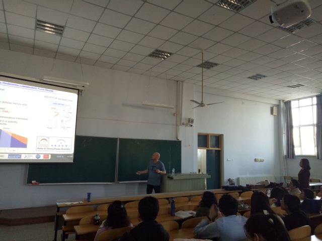 报告开始后,Hildebrandt教授首先向大家介绍了巴黎第十一大学的主要概况和科研师资力量等情况。其次,详细介绍了他的课题研究内容,包括时间分辨和时间门控FRET,镧系元素/染料/量子点之间的FRET用于光谱和时间多路发光检测的特定优势,及其在不同均相单步FRET生物传感器中的最新应用:灵敏和特异性检测来自低体积液体样品、细胞膜或细胞内部的多种生物标记物。