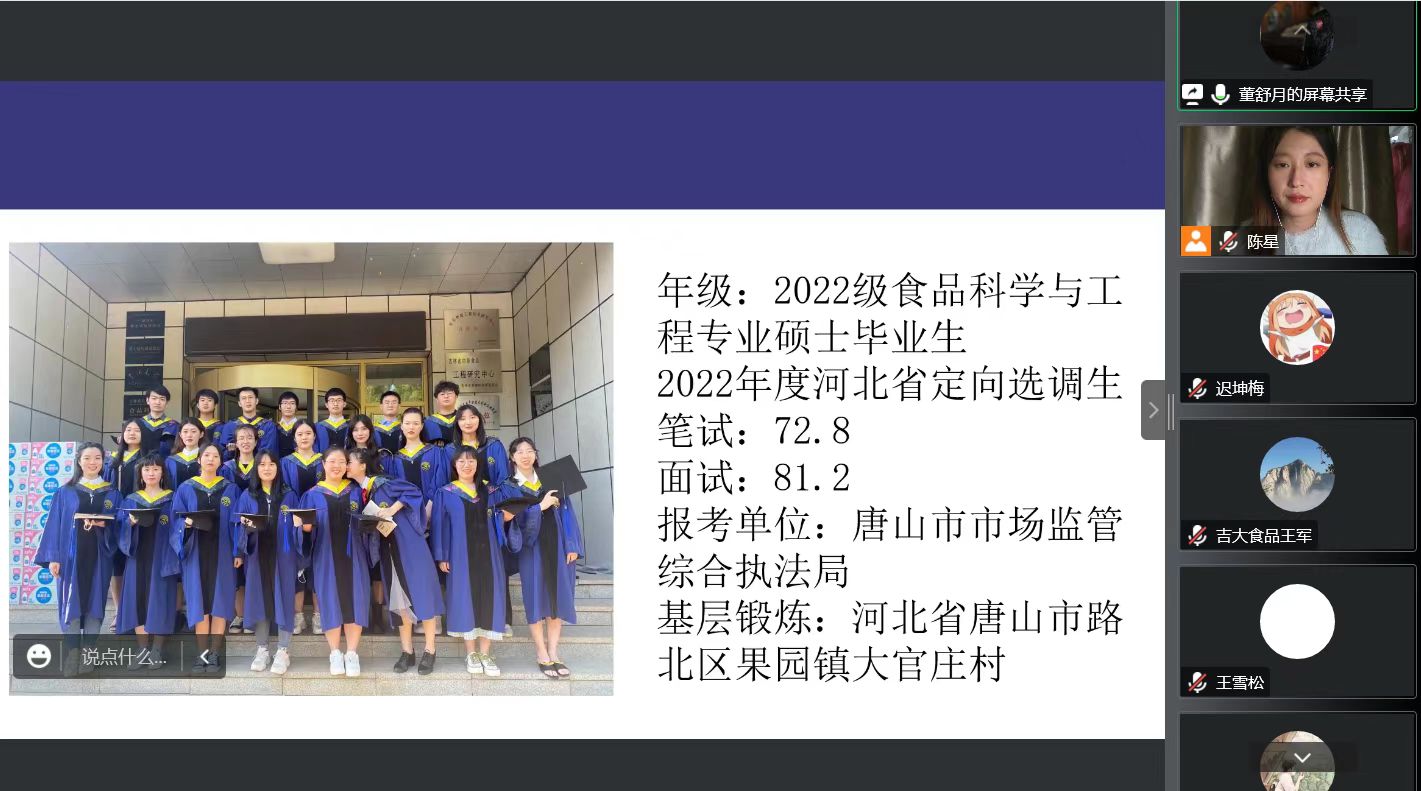 于12月3日通过腾讯会议开展了研究生就业分享交流会。我院2022届毕业生董舒月同学(河北省定向选调生)、2022届毕业生赵艳丽同学(吉林省定向选调生)、2021届毕业生王雪松同学(伊利奶粉事业部选培生)分别就选调生方面和企业方面的经验进行了精彩分享。会议由学院就业兼职辅导员陈星同学主持,学院行政副院长陈玉江、科研与研究生办公室主任王军、全体2023届毕业研究生和对分享会感兴趣的同学们聆听了本次分享会。