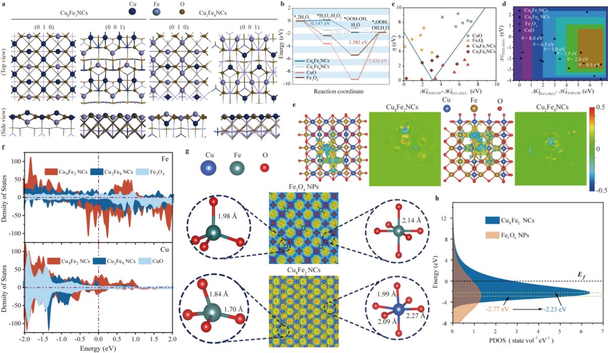 针对上述技术瓶颈与市场需求,研究团队基于TNPS策略,构建了CuO-Fe₃O₄孪晶结构的CuFe NCs。该结构通过Cu²⁺离子的持续电子供体特性,搭建高效电子转移通道,显著加速Fe³⁺向Fe²⁺的还原转化,从而稳定维持其催化活性。密度泛函理论(DFT)计算揭示,Fe原子的不对称四配位构型使3d轨道能级更靠近费米能级,促进Cu→O→Fe的高效电子转移,大幅提升催化动力学效率。其中,Cu₈Fe₂ NCs表现出最优催化性能,米氏常数(Kₘ)低至 0.54 mM,最大反应速率(Vₘ)达 19.20×10⁻⁸ mM・s⁻¹,展现出优于其他双金属纳米酶的底物亲和力与催化活性。