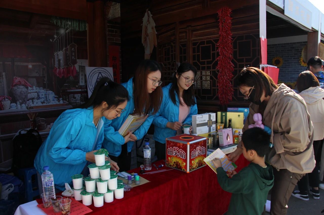 与其他14个学院根据自身涉农领域,将传统优秀农耕文化遗产与现代科技文明相结合,在田间组织劳动实践,切身体悟劳动的意义。活动过程中,我院设置了食品知识问答与立定跳远两个游戏项目,收集了生活中常见的食品安全相关问题作为知识问答题目,让同学们在参与活动的同时更加了解食品安全,提高食品科学素养。活动的奖品是学院前一天精心准备的自制酸奶,在现场吸引了众多同学参加挑战,受到了大家的一致好评。我院还在实践区展览了不少本院生产研发的各种酒类、食品药品以及保健品等,不仅展现了食品学院的风采,而且能让感兴趣的同学们更加了解食品专业的产品研发方向和研究成果。